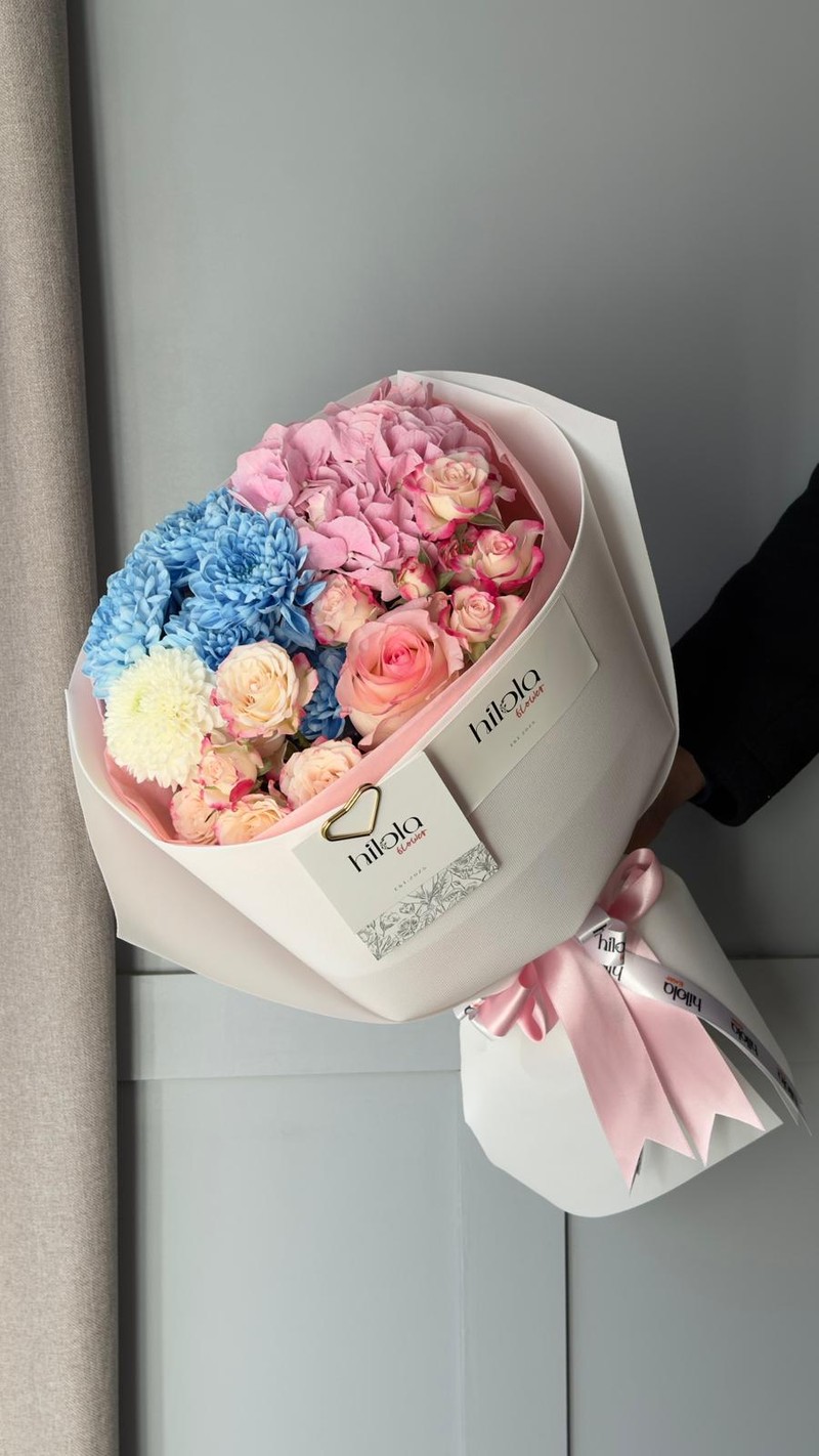 Altaj Delft Blue, Ortanca ve Rhoslyn – Pastel Esinti buketi, mavi ve pembe tonların büyüleyici buluşmasını sunar. Delft Blue Altaj krizantemlerin nadir ve göz alıcı mavi tonu buketin yıldızı olurken, pembe ortancanın dolgun yaprakları zengin bir hacim katar. Anastasia'nın bembeyaz yaprakları tazelik ve zarafet sunarken, Rhoslyn güllerinin yumuşak pembesi romantik bir dokunuş ekler. Reflex çardak güllerinin krem tonu ise tüm renkleri uyumlu bir bütünde birleştirir.