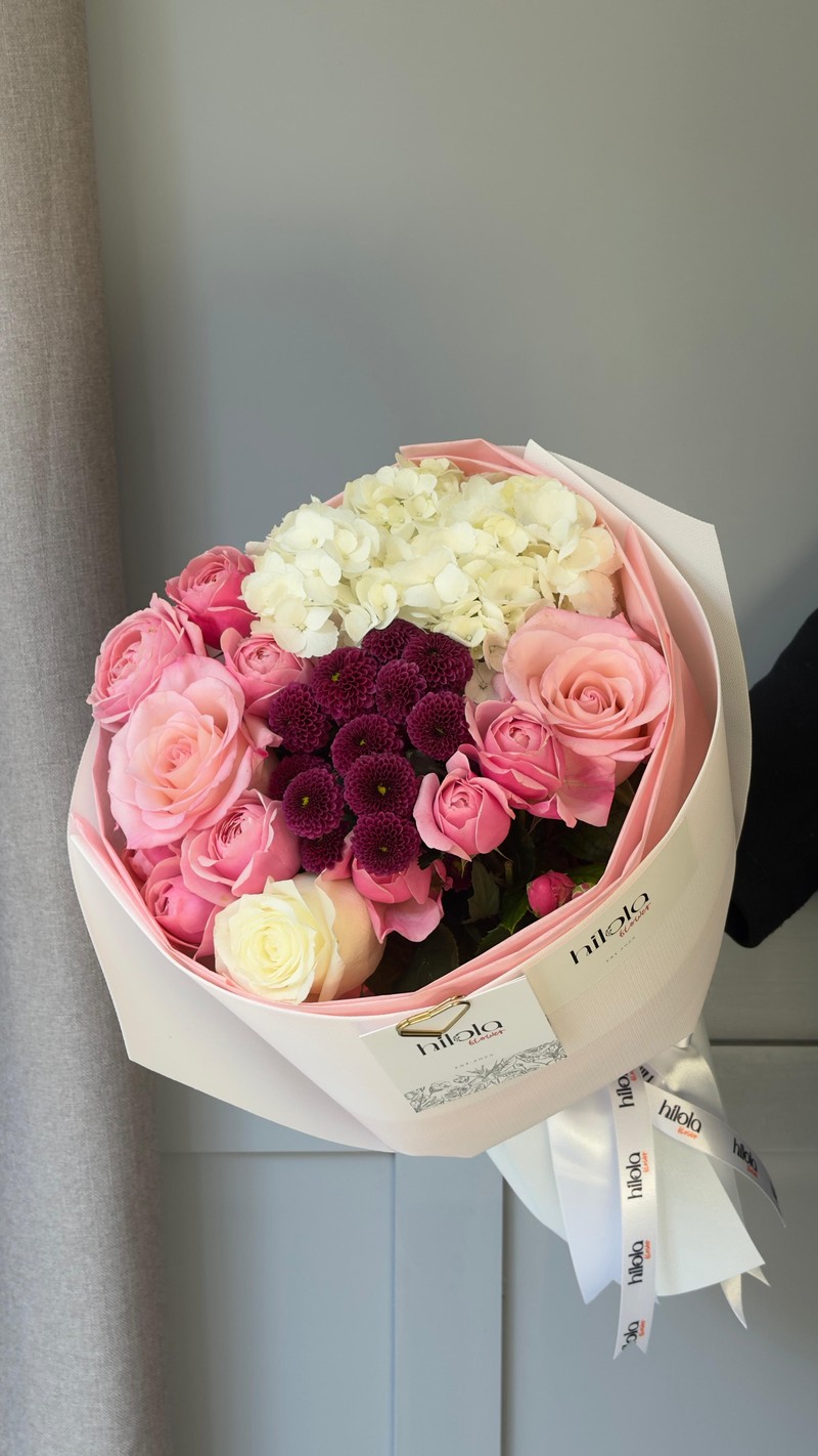 Beyaz Ortanca, Playa Blanca ve Kahala – Beyaz Pembe Zarafet buketi, saf beyaz ve narin pembe tonların ışıltılı bir uyumunu sunar. Beyaz ortancanın dolgun ve ferah hacmi buketin merkezinde dingin bir şıklık oluştururken, Playa Blanca güllerinin saf beyazı kompozisyona asil bir tazelik katar. Kahala'nın sıcak yavru ağzı tonu ve Silva Pink saray güllerinin cömert pembe formu bukete romantik bir derinlik kazandırır. Purpetta'nın ince mürdüm dokunuflları ise bu beyaz-pembe tabloyu tamamlayan sofistike bir detaydır.