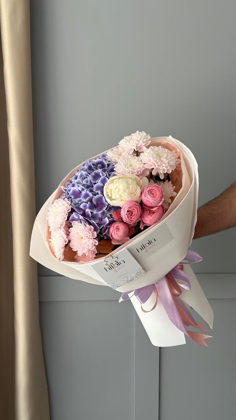 İnci Bahçesi – Mor Ortanca, Pembe Gül & Şakayık Valsi, lüks ve romantizmin zarif bir yorumudur. Mor ortancaların büyüleyici derinliği, şakayıkların gösterişli ihtişamı ve pembe güllerin naif dokunuşu, inci beyazı krizantemlerle birleşerek görsel bir vals oluşturur.