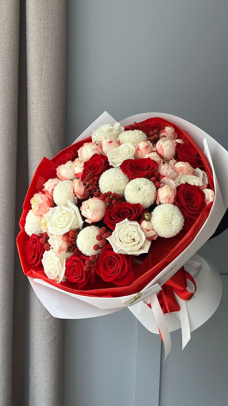 “Scarlet Harmony”, kırmızı Ekvador güllerin güçlü enerjisini beyaz güllerin temiz zarafetiyle bir araya getirir. Yuvarlak hatlı beyaz pompon krizantemler kompozisyona hacim ve ritim kazandırır; buketin formunu daha modern ve derli toplu bir siluete taşır. Kırmızı hypericum detayları ise tasarıma sıcak bir derinlik ekler — küçük ama belirleyici bir imza.