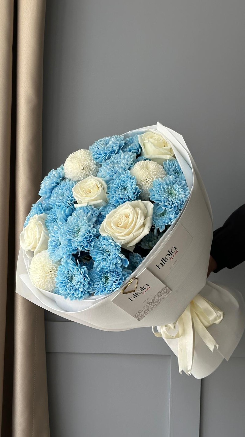 “Arctic Bloom”, soğuk tonların dinginliğini minimalist bir çizgide sunan özel bir kompozisyondur. Mavi Altaj krizantemlerin çok çiçekli dokusu bukete zengin bir yapı ve belirgin bir ritim kazandırır; beyaz güller ise kompozisyonu temizler, netleştirir ve daha rafine bir görünüm sağlar. Sonuç: ferah, düzenli ve modern bir siluet.