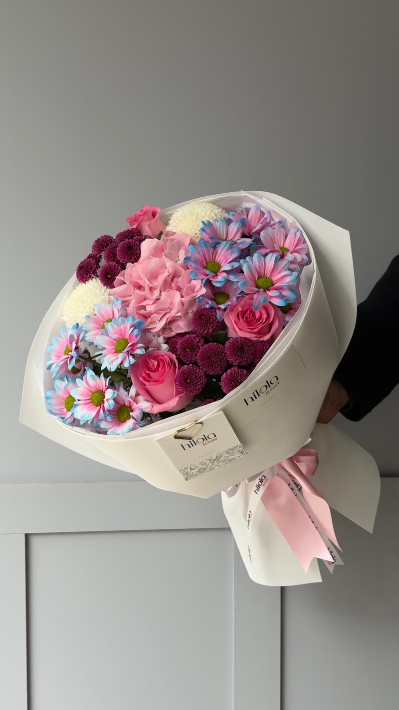 Ortanca, Anastasia ve Purpetta – Pembe Senfoni buketi, pembe ve mor tonların büyüleyici bir senfonisini sunar. Pembe ortancanın dolgun ve görkemli yaprakları buketin kalbinde yer alırken, Anastasia'nın saf beyaz krizantemleri zarif bir kontrast oluşturur. Purpetta'nın mürdüm tonları derinlik katarken, Bublegum krizantemlerin mavi-pembe geçişli yaprakları bukete eşsiz bir karakter kazandırır. Wham güllerinin canlı pembesi ise tüm bu tonları neşeli bir enerjiyle tamamlar.