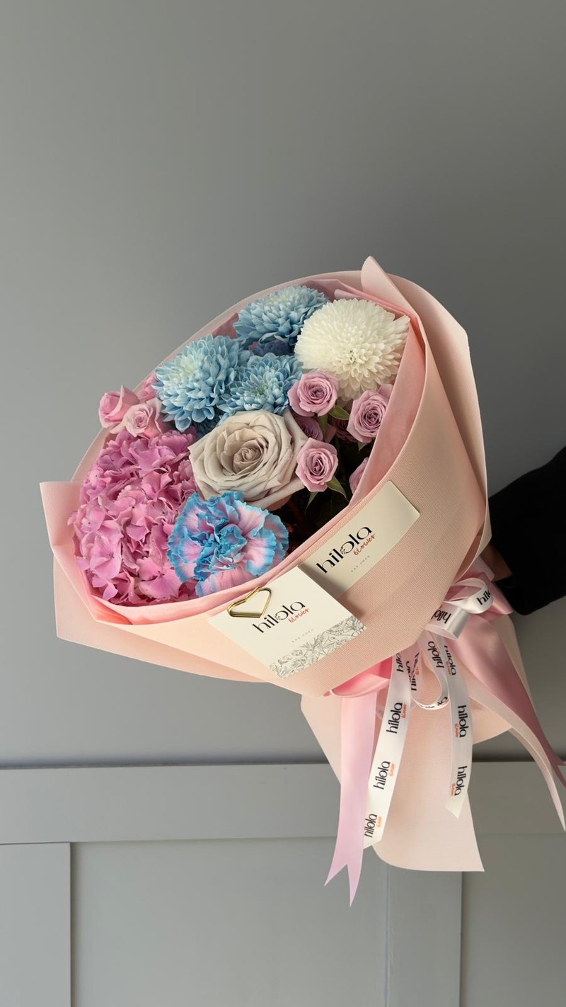 Pembe ortancanın zarif hacmi, Leila çardak güllerinin lila romantizmi, Deft Blue Altaj krizantemlerin büyüleyici mavisi, Anastasia'nın saf beyaz inceliği, Brownies karanfillerin sıcak toprak tonu ve Menta'nın lila dokusuyla hazırlanan ince düşünülmüş bir buket. Her çiçek, birbirini tamamlayan renk geçişleriyle özgün bir armoni oluşturur.