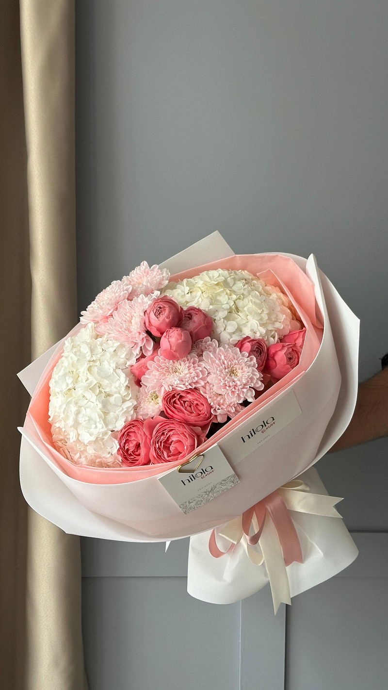“Saf Büyü”, yumuşak pastel tonları dokusal bir zenginlikle bir araya getiren modern bir kompozisyondur. Beyaz ortanca bukete bulut gibi bir hacim ve temiz bir zemin kazandırır; Silva Pink saray gülleri katmanlı yapısıyla romantik bir sıcaklık ve zarif bir merkez oluşturur. Light Pink Altaj krizantemlerin çok çiçekli dokusu ise tasarıma ritim ve dolgunluk katar; buketin siluetini daha derli toplu ve güçlü hale getirir.