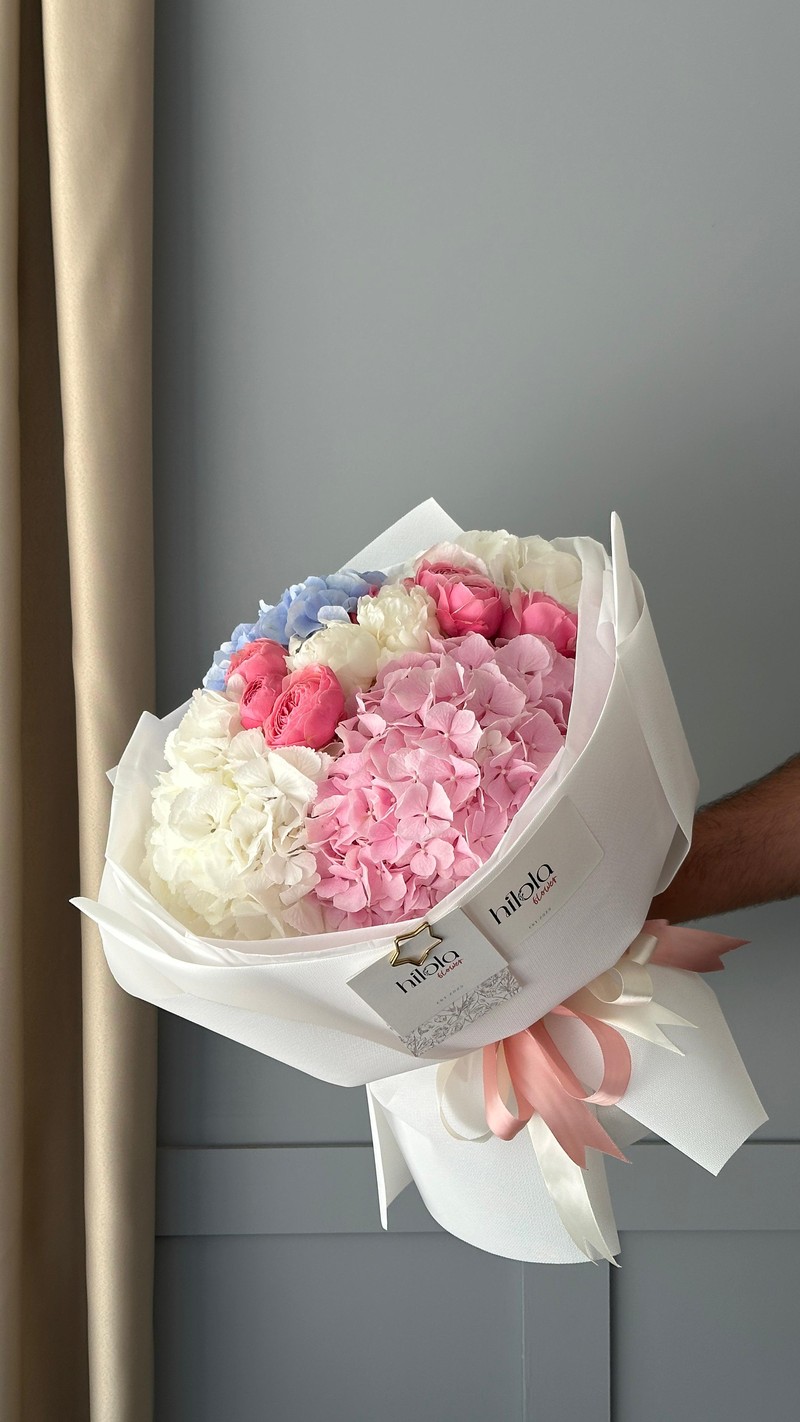 Crystal Bloom – Beyaz Şakayık & Pastel Ortancalar, zarif pastel tonların bir araya geldiği lüks bir Hilola Flower tasarımıdır. Saf beyaz şakayıkların asaleti, pembe ve bebek mavisi ortancaların romantik pastel tonlarıyla birleşerek büyüleyici bir görüntü ortaya çıkarır. Silva Pink saray güllerinin yumuşak dokunuşu, bukete modern bir zarafet ekler.