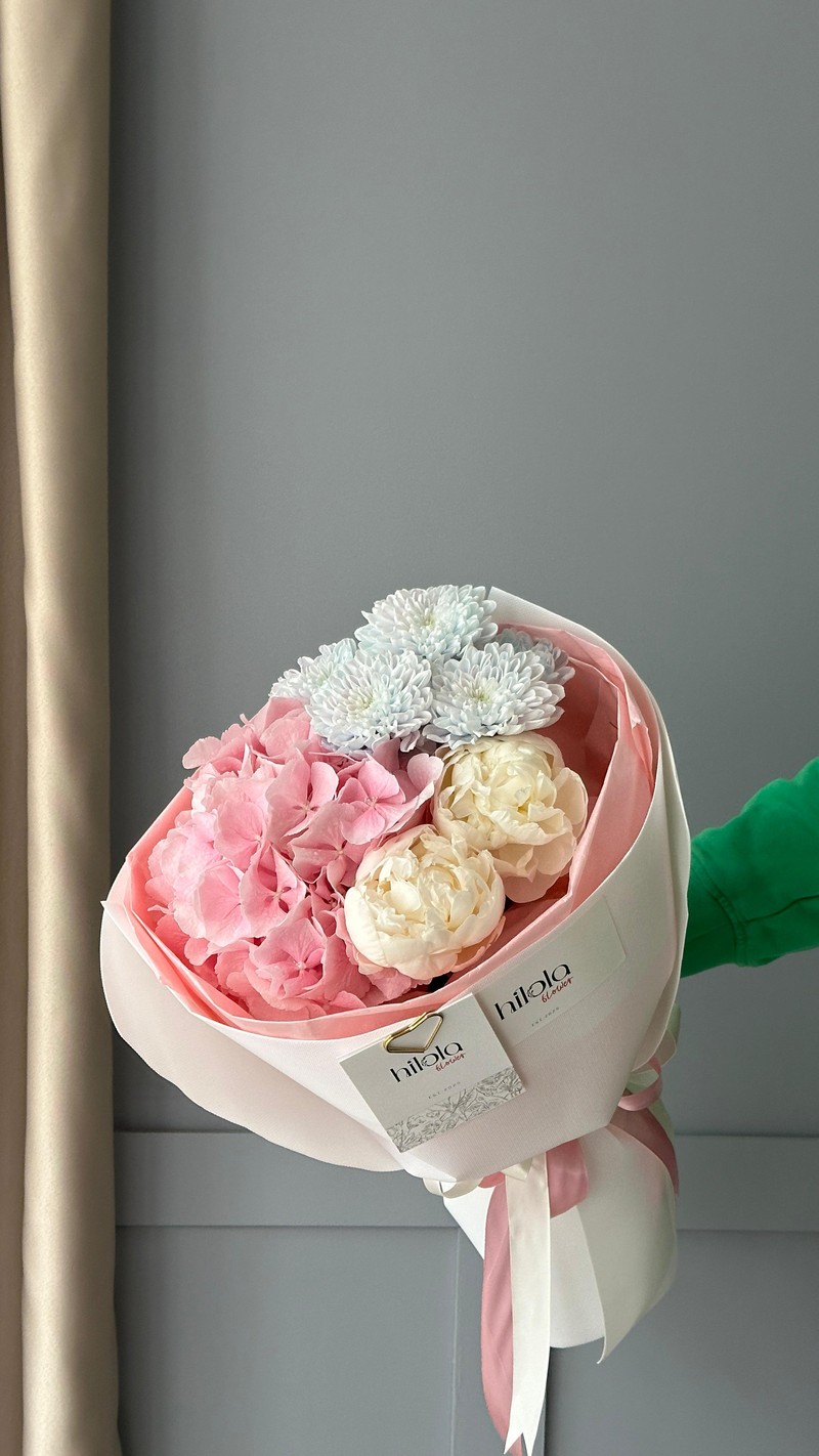 “Zarif Büyü”, yumuşak pembe ve beyaz tonların dengeli buluşmasını dokular üzerinden anlatan modern bir kompozisyondur. Pembe ortanca bukete ipeksi bir hacim ve romantik bir geçiş kazandırır; beyaz şakayıklar katmanlı yapısıyla tasarıma premium bir odak ekler. Krizantemler ise çok çiçekli dokusuyla formu güçlendirir, buketin siluetini daha dolgun ve derli toplu kılar.
