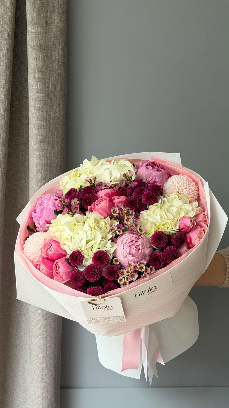"Pastel Rüya", farklı doku ve renkleri tek bir bukette harmanlayan rafine bir tasarımdır. Pembe şakayıkların katmanlı yapısı ve ipeksi dokusu bukete romantik bir ruh katarken; beyaz ortancaların yumuşak hacmi saf bir zemin oluşturur. Krizantem Santini Purpetta'nın mor tonları sofistike bir derinlik ekler; Silva Pink saray güllerinin çok çiçekli formu ve Anastasia'nın light pink tonu zengin bir doku sunar. Wax çiçeklerinin ince dalları ise kompozisyonu tamamlayan narin detaylar olarak öne çıkar.