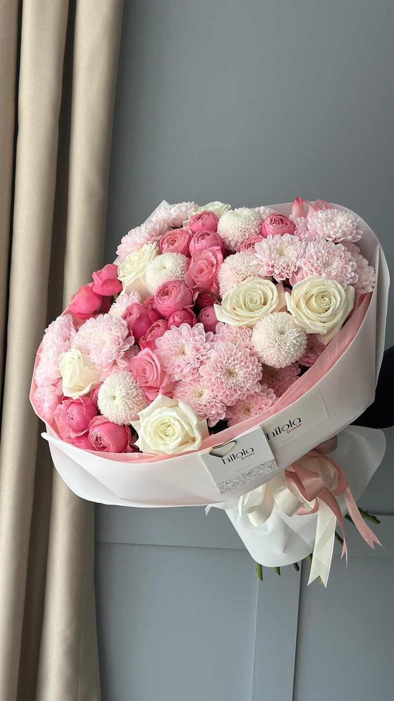 Her buket, Hilola Flower’ın imza paketlemesiyle tamamlanır: sade, modern ve kusursuz.