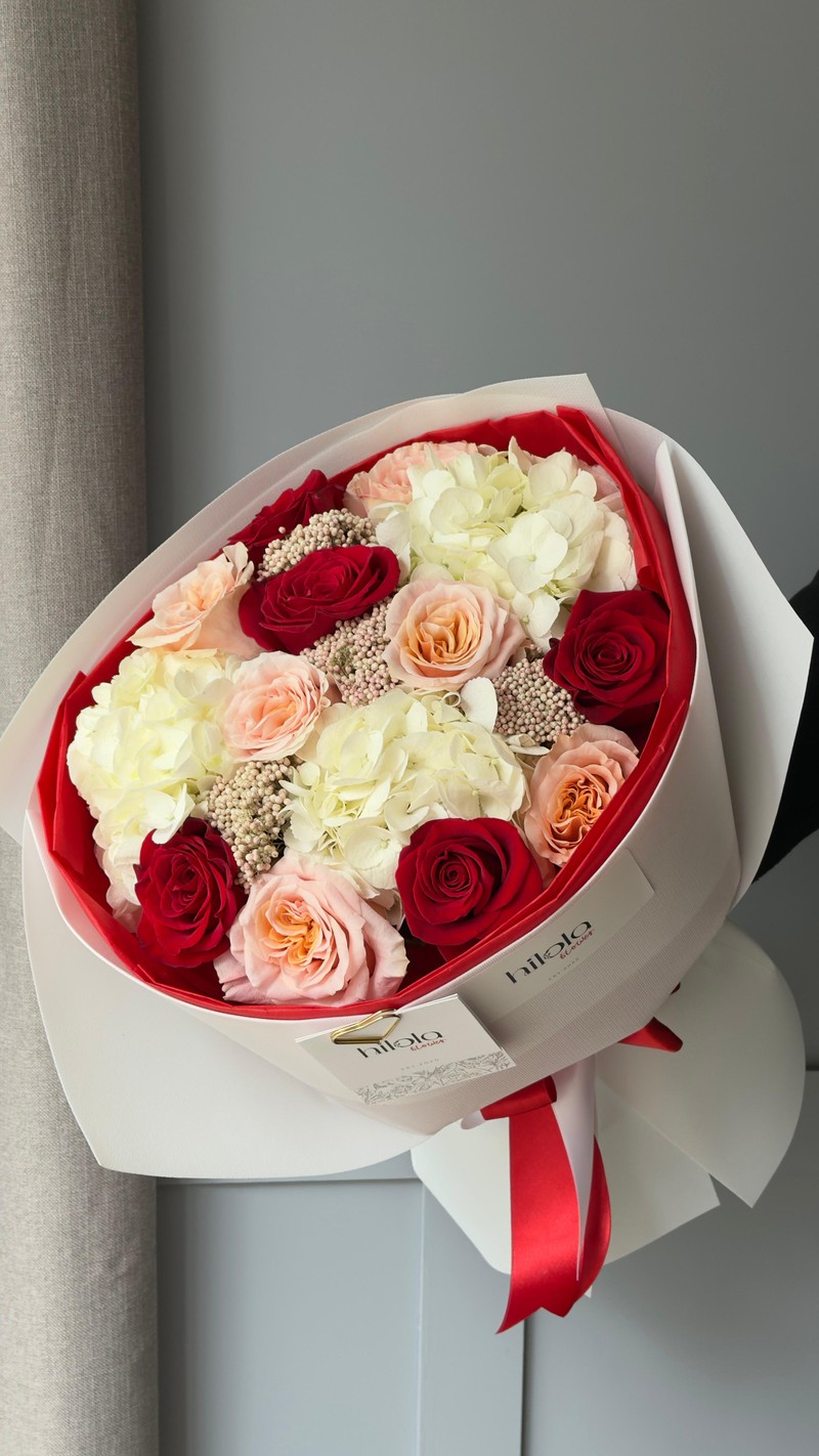"Romantik Kontrast", pembe ve kırmızının tutkulu buluşmasını beyazın dinginliğiyle dengeleyen sofistike bir tasarımdır. Shimer güllerinin pembe tonları bukete romantik bir sıcaklık katarken; Freedom'un derin kırmızısı güçlü bir karakter ve tutku ekler. Beyaz ortancaların yumuşak hacmi kompozisyona ferah bir denge sağlar; pembe Ozothamnus dokunuşları ise ince detaylarla buketi tamamlar.