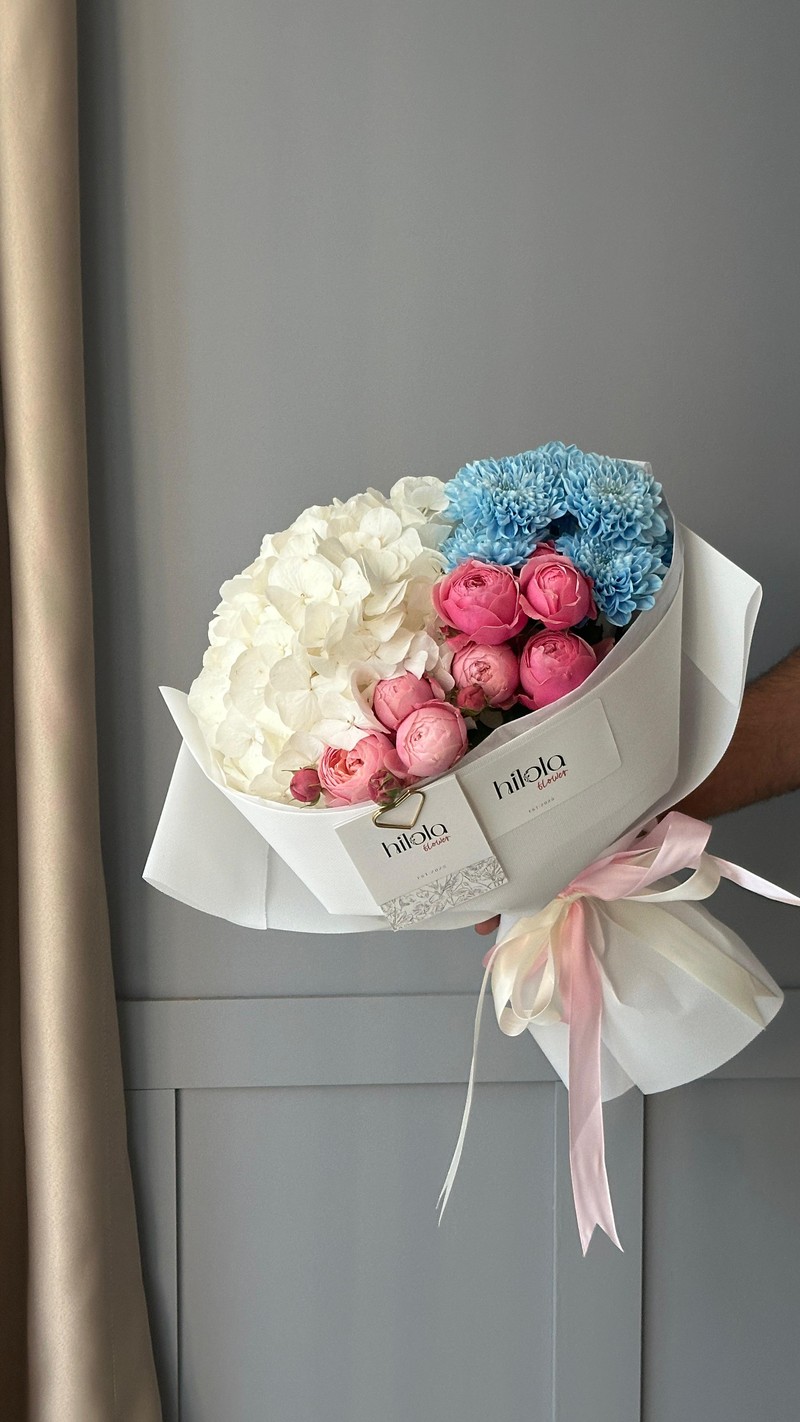 Elegant Grace, Silva Pink saray güllerinin zarif romantizmini beyaz ortancaların saf şıklığı ve mavi krizantemlerin modern havasıyla harmanlar. Pastel tonların uyumlu birleşimiyle ortaya çıkan bu aranjman, hem zarif hem de göz alıcı bir hediye alternatifi sunar.